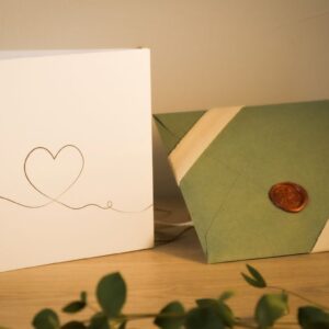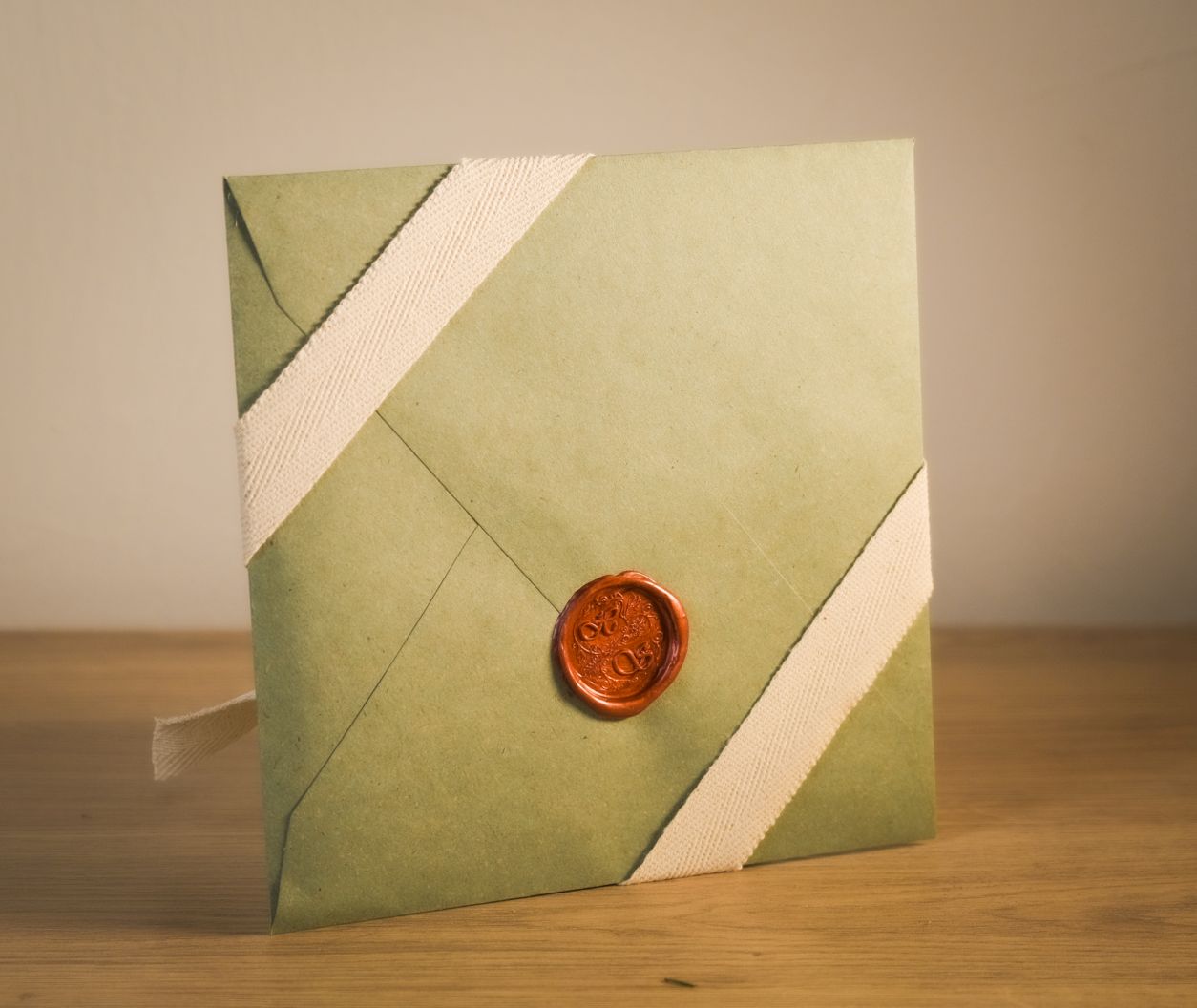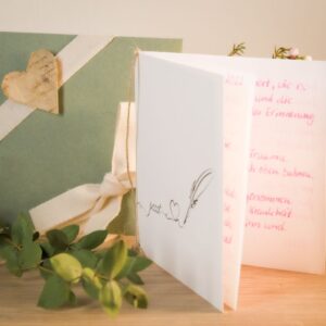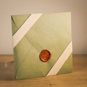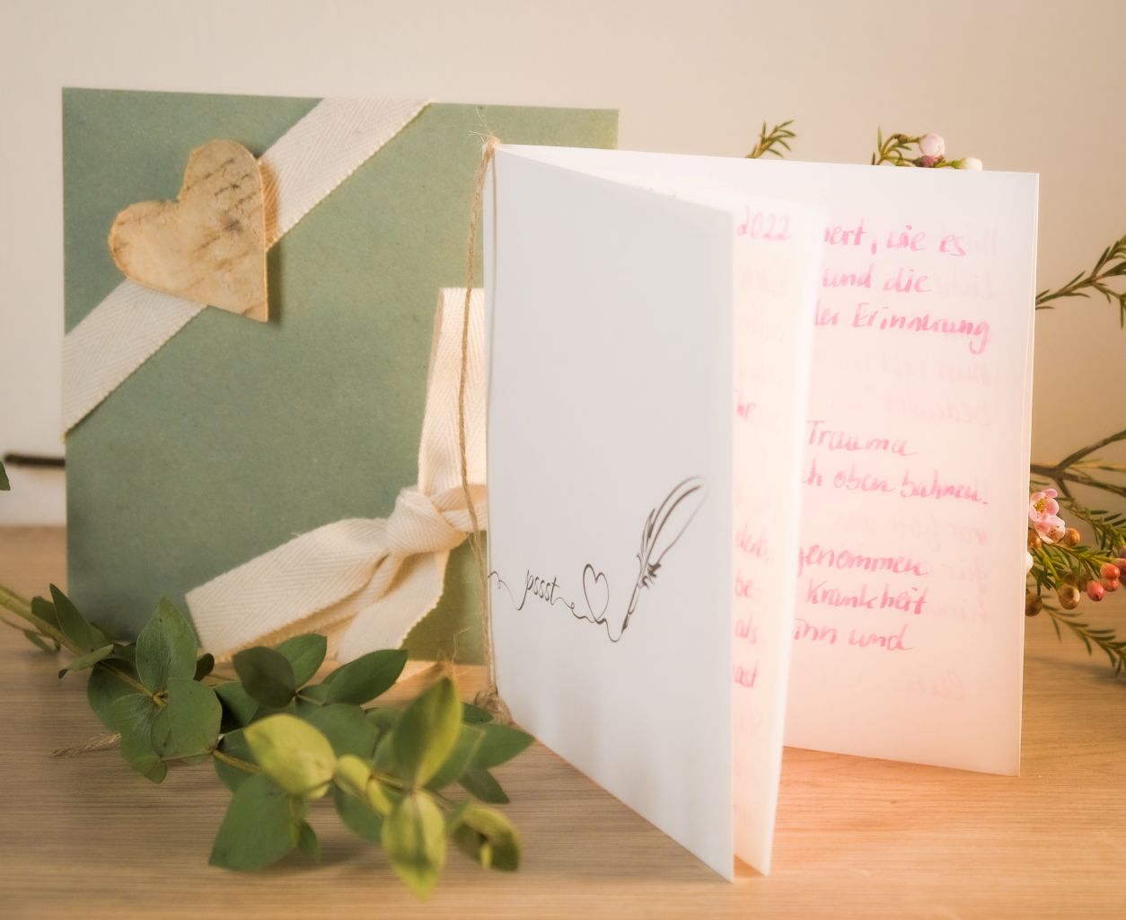 Nach dem Trocknen wird die Karte sorgsam kuvertiert, mit dem Siegel von Heikes Seelenbriefe versehen und mit einem Gewebeband geschnürt. Somit ist die Einzigartigkeit und Diskretion garantiert.